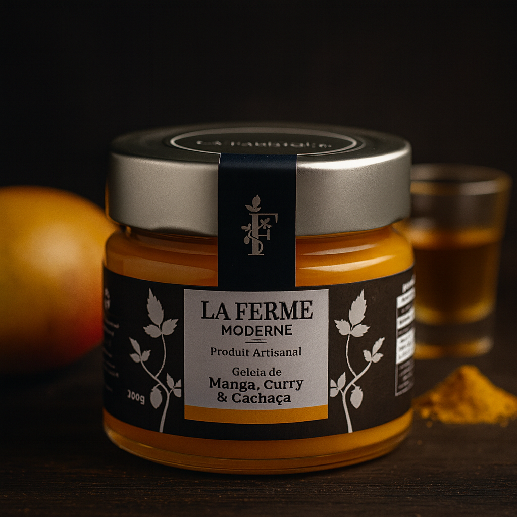 Exótica e aromática, essa geleia combina a doçura da manga com o toque especiado do curry, o frescor do gengibre e notas sutis de cachaça artesanal.