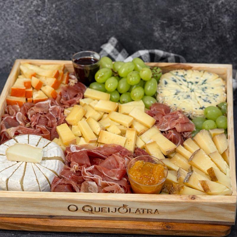Tudo servido em uma tábua de madeira Pinus (34 x 22 cm), já montada, elegante e reutilizável depois.